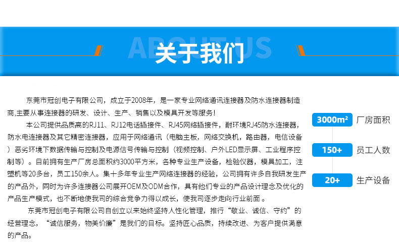 本公司提供優(yōu)良的RJ11、RJ12電話插接件、RJ45網(wǎng)絡(luò)插接件,耐環(huán)境RJ45防水連接器,防水電連接器及其它精密連接器,產(chǎn)品應(yīng)用于網(wǎng)絡(luò)通訊(電腦主板,網(wǎng)絡(luò)交換機,路由器,電信設(shè)備)、惡劣環(huán)境下數(shù)據(jù)傳輸與控制及電源信號傳輸與控制(戶外LED顯示屏、機器控制、工業(yè)程序控制等)